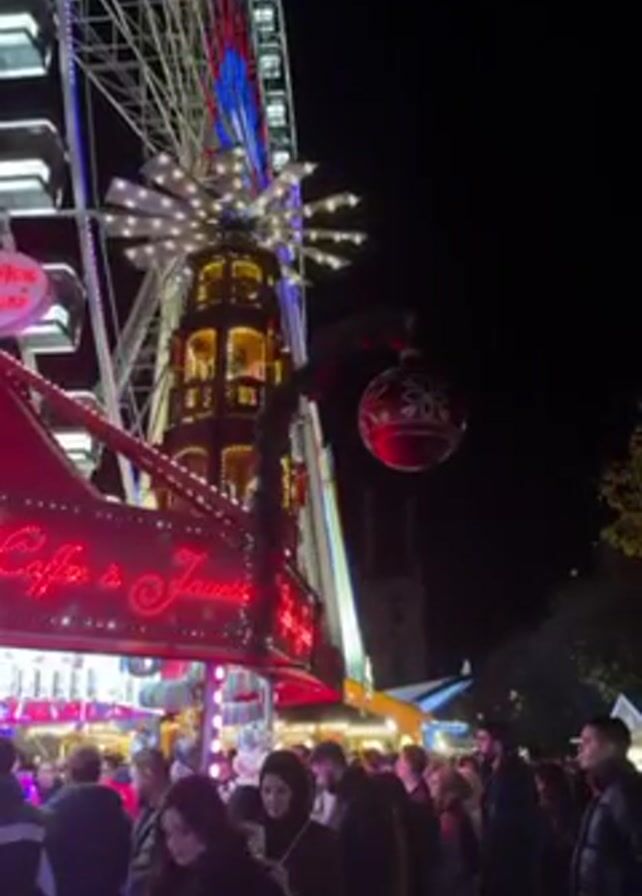 The scene is a nighttime view of a Christmas market or fair, crowded with people