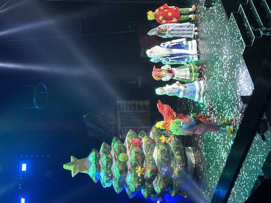 The image depicts an indoor stage performance within a theatrical venue in Unknown, Russia. Seven individuals in elaborate costumes are positioned on a dark stage floor, which is scattered with white confetti-like material. On the left side of the stage stands a large, multi-tiered, stylized Christmas tree prop, predominantly green with white snow accents, adorned with colorful ornaments and topped with a prominent yellow star. Behind the performers, a rustic-looking wooden log cabin prop with a dark doorway is visible. Above the stage, blue spotlights illuminate the scene, casting visible light rays, and a circular rigging element is suspended from the ceiling in the upper background. From left to right, the costumed individuals are: 1. A figure in a shaggy green costume with a long green wig, holding a staff, partially facing away. 2. A figure in a vibrant red costume with large red wings and an orange/yellow headpiece. 3. A figure dressed in a light blue gown with white fur trim and a white wig, resembling a Snow Maiden. 4. A figure in colorful traditional Russian folk attire, with a multi-layered skirt and a headpiece, gesturing with hands raised. 5. A central figure dressed as Ded Moroz (Father Frost) in a blue and white fur-trimmed coat, tall hat, and long white beard, holding a staff. 6. A figure in a dark blue patterned gown with white fur trim and a matching hat, also resembling a Snow Maiden. 7. A figure in a red and green tunic with yellow accents and short yellow hair. The performers are arranged in a line, mostly facing the center or slightly right. The foreground reveals the dark edge of the stage, with steps descending on the right.