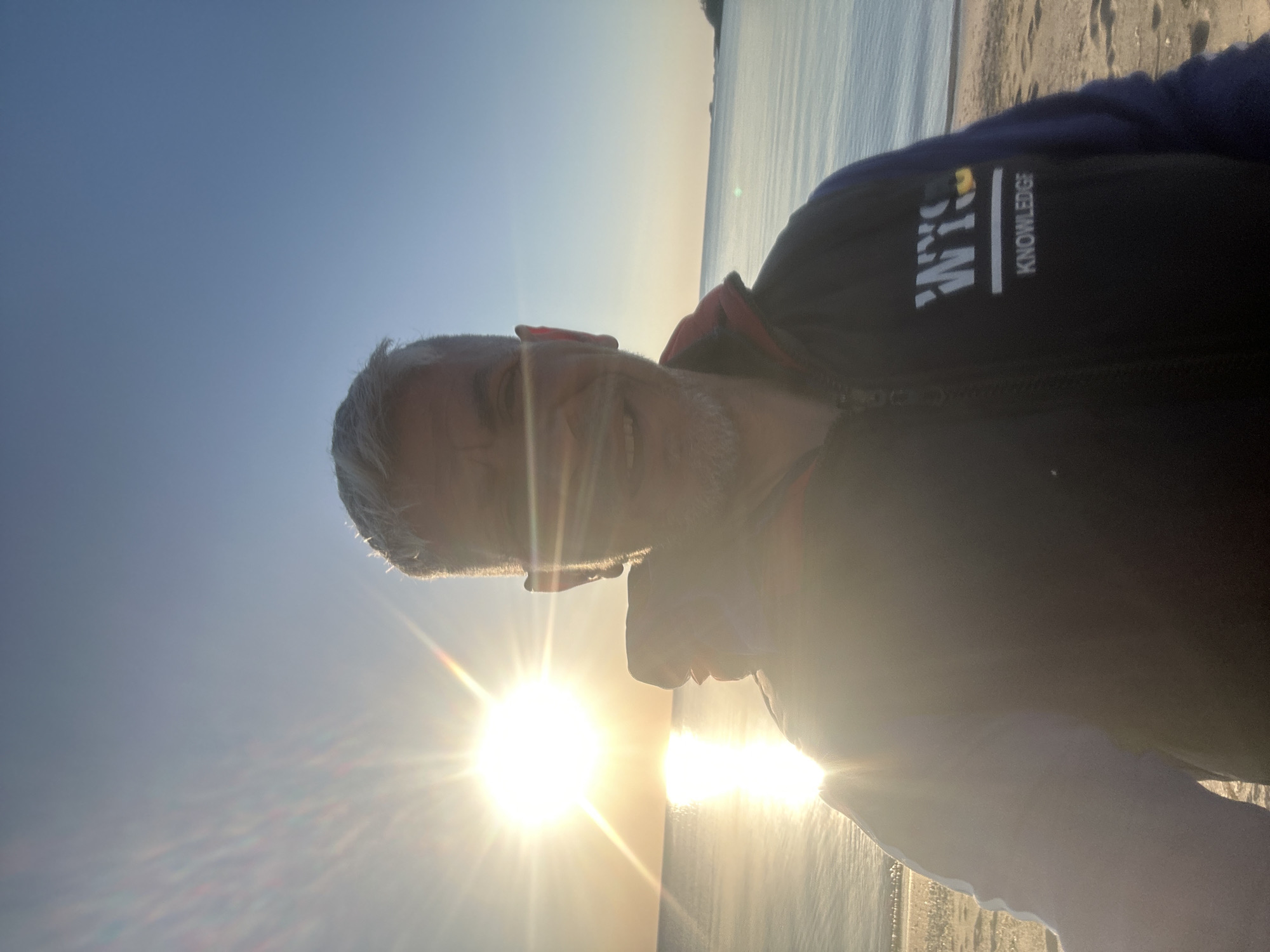 man with gray hair standing on a beach in Kiten, Bulgaria. He is wearing a black jacket with white lettering that says "W1S KNOWLEDGE". The sun is shining brightly behind him, obscuring some of the details. The beach appears to be sandy, and the ocean is visible in the background.