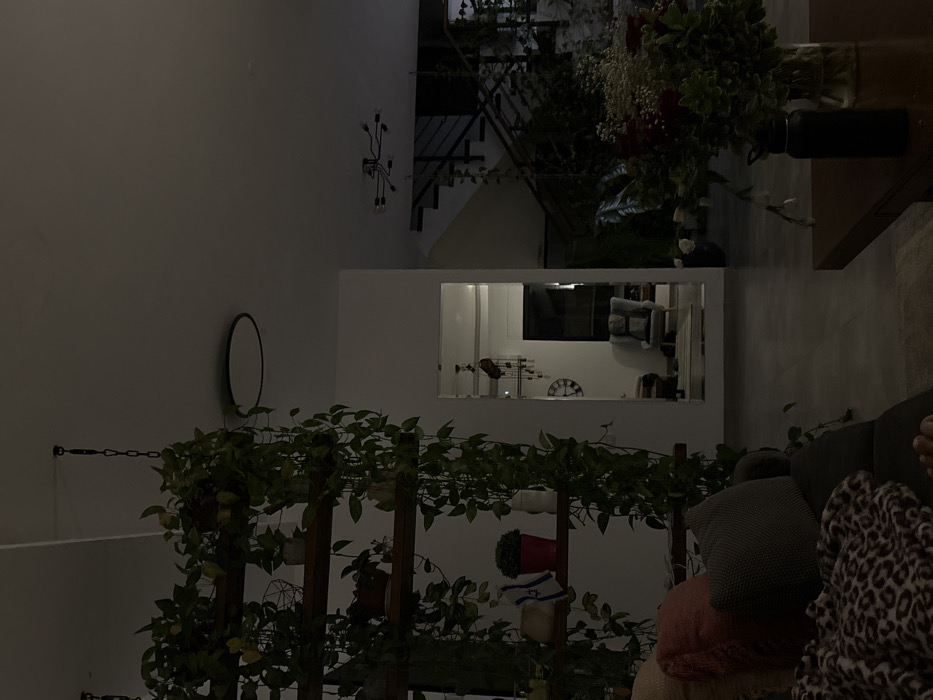 The image depicts a dimly lit residential interior within the Arvot Hayarden Regional Council, Palestinian Territory, captured from a low perspective, likely from a sofa. In the immediate foreground, to the left, a section of a dark-colored sofa is visible, covered by a leopard-print blanket, with a bare human foot partially present. Above the sofa, a multi-tiered wooden shelving unit suspended by chains from the ceiling is densely populated with various potted plants, many exhibiting trailing vines. One shelf holds a red pot, a white vase, and an item draped with what appears to be an Israeli flag. To the right, a dark wooden coffee table supports a black water bottle and a clear glass vase containing a floral arrangement of red roses, white filler flowers, and green foliage. The background features a tall, rectangular mirror reflecting a brighter adjacent room, revealing a wall clock with Roman numerals, a hanging decorative item, and a gray armchair. To the right of the mirror, a modern, open-tread staircase with dark metal railings ascends. Additional greenery and plants are situated near the base of the staircase. The white ceiling displays a large, dark-rimmed circular light fixture and a smaller, multi-arm chandelier-style fixture further in the distance. The overall scene is characterized by dim, ambient lighting, indicating an evening or nighttime setting. No individuals are explicitly visible in the primary scene.