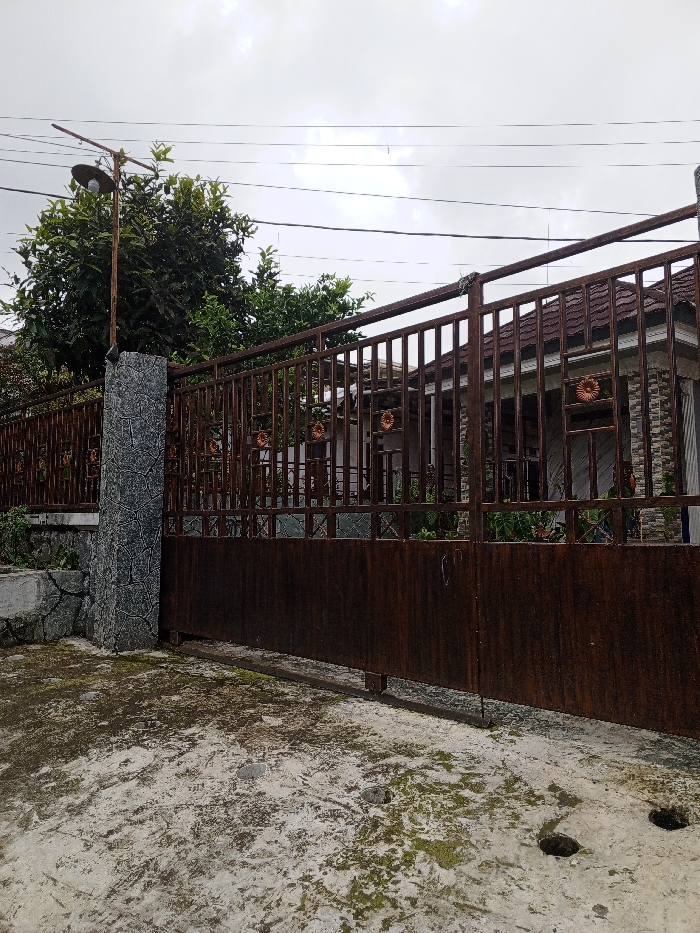 A rusty brown metal gate and fence enclose a house. The gate is partially closed, revealing a gray stone facade and terracotta roof. A stone pillar supports the gate and fence on the left. A weathered lamp post is positioned near the pillar. The foreground concrete is mottled with moss and includes three dark holes. Overcast sky is visible.