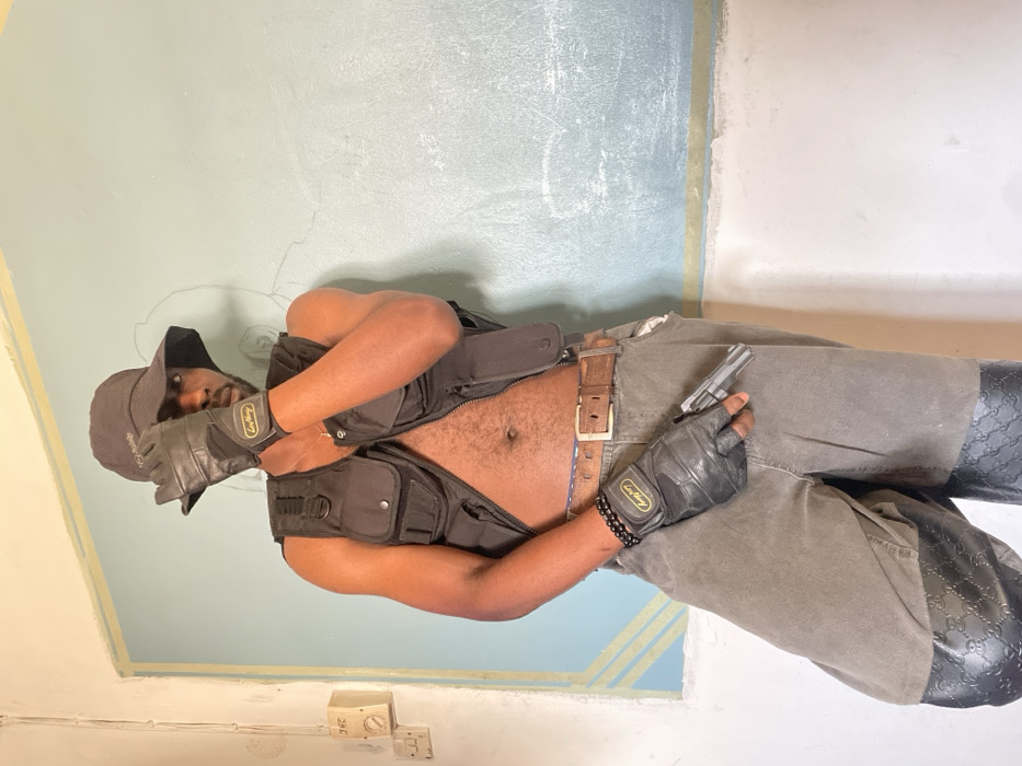 An adult male stands indoors against a two-toned wall in the city of Jos, Nigeria. The upper wall section is light blue-green with faint markings, while the lower section is off-white, separated by a thin horizontal stripe. Two white electrical wall fixtures are visible on the left. The male wears a dark bucket hat, an unzipped black tactical vest exposing his chest and abdomen, grey cargo-style trousers, and black knee-high boots with an embossed pattern. Black fingerless leather gloves are on both hands, with a yellow "Leo King" logo visible on the right glove's wrist strap. A brown leather belt with a gold buckle is worn around his waist. A black beaded bracelet is on his left wrist, and a small cross pendant is visible on a necklace. His right hand is raised, partially obscuring his face. His left hand holds a small, silver-colored revolver, pointed downwards.