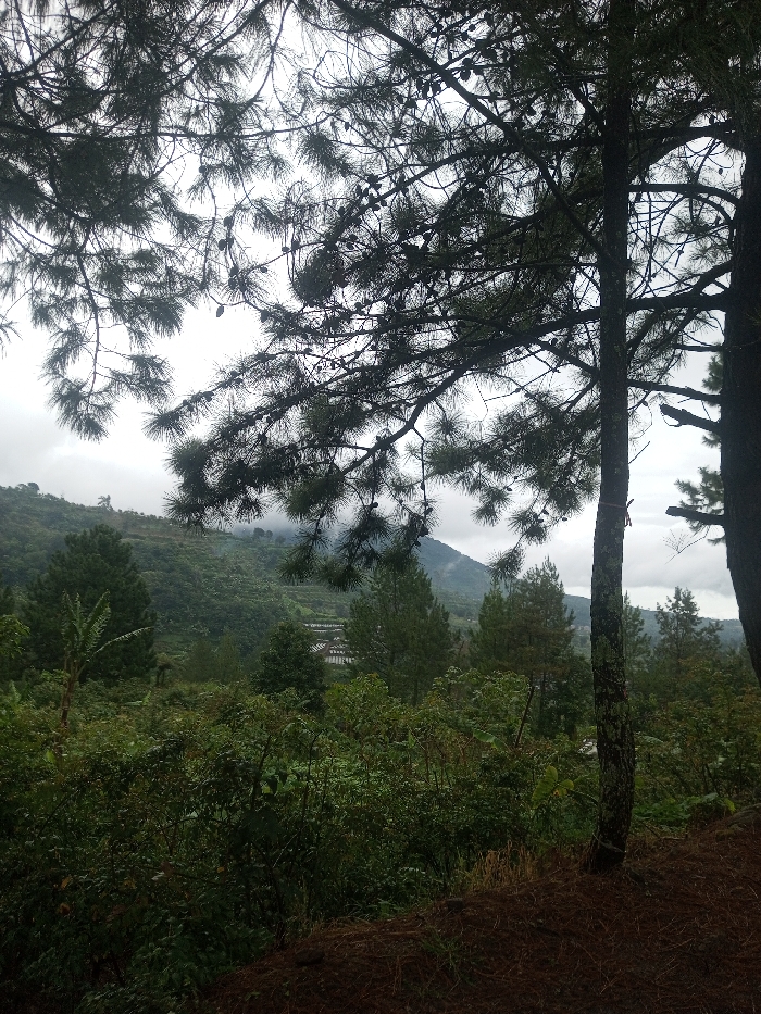 A dense forest scene unfolds under a cloudy sky. Tall pine trees with prominent needles dominate the foreground, some bearing small cones. Below, a thick undergrowth of lush green vegetation covers the ground. In the distance, a forested hillside is visible, partially obscured by mist or low-hanging clouds. A building complex is also subtly visible nestled among the trees. The overall tone is peaceful, hinting at a cool, damp environment.