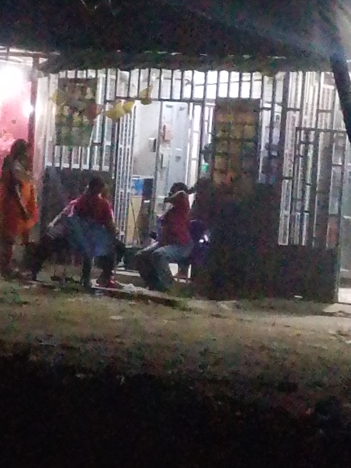 Location: Sabon Gari West, Nigeria. The scene depicts an outdoor nighttime gathering of individuals in front of a secured building. The lighting is dim. The foreground consists of rough, unpaved ground with sparse vegetation, leading to a slight rise or curb. In the background, a structure, likely a building or storefront, features a facade secured by multiple vertical and horizontal metal bars or grates. Interior lighting within the building is faintly visible. Yellow, indeterminate objects are suspended from the upper portion of the metal security work. Four individuals are present. To the far left, a person stands, dressed in an orange or reddish long garment. Adjacent, a second person, wearing a red top and blue lower garment, is in a bent or crouching posture, focusing on a dark, indistinct object situated on the ground between themselves and a third person. This third individual is seated on a low, dark object, possibly a stool, also wearing a red top and blue lower garment, and appears to be interacting with the aforementioned dark object on the ground. A fourth, indistinct presence is partially visible to the far right, largely obscured by shadows. The central individuals appear engaged in an activity near ground level, centered around the dark, ambiguous object.