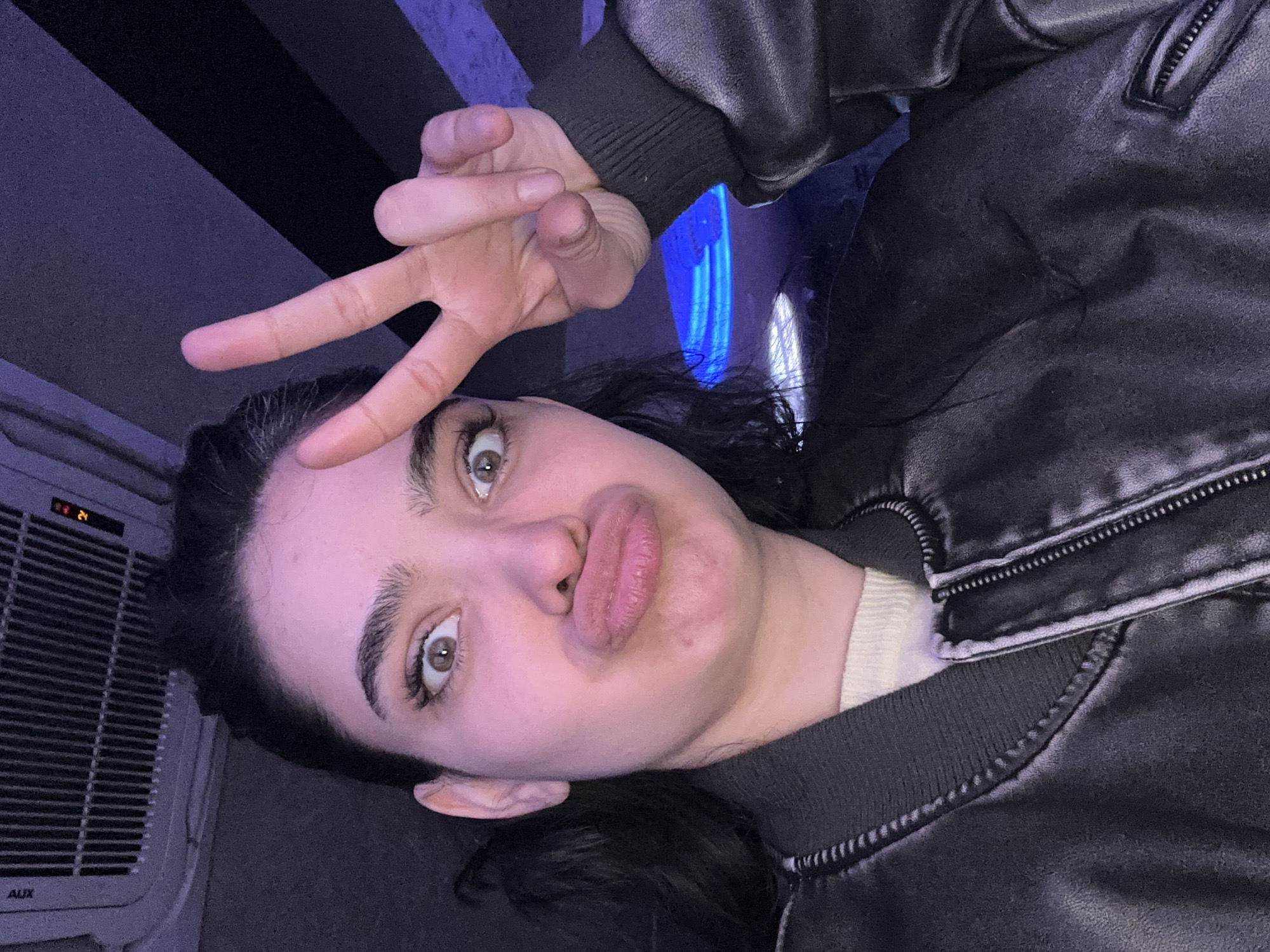 A woman is posing for a selfie with a "peace sign" gesture. She is wearing a black leather jacket over a light-colored sweater. Her expression includes pursed lips. An air conditioning unit is visible in the background. Based on the information provided, it is not possible to determine whether the image was taken in the city of Haskovo, Bulgaria.