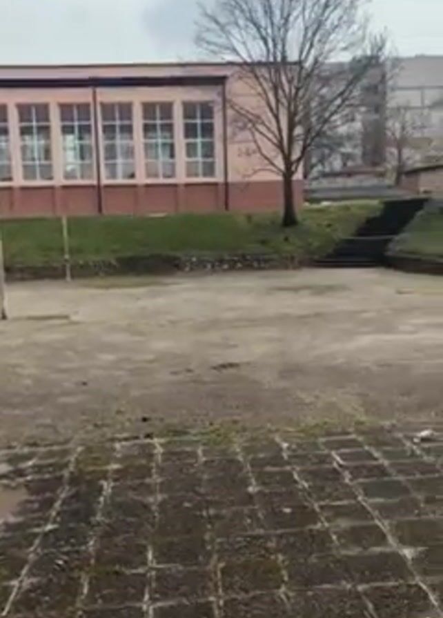 n outdoor, paved area, likely a courtyard or sports field, with a building in the background that has a light pink facade and multiple windows. There is a grassy slope behind a low retaining wall. There are some sparse trees and other buildings visible in the distance. A small, pink object appears to be dropped onto the paved area in the foreground. The overall impression is of a somewhat dreary, possibly neglected outdoor space.