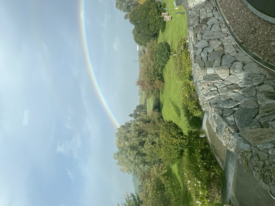 A panoramic view of a verdant landscape in Ribeauvillé, France, is presented under a partially cloudy sky. A distinct, multi-colored rainbow arches across the upper portion of the frame, originating in the upper left and descending towards the upper right. In the foreground, a curved retaining wall constructed from irregular gray stones occupies the lower right, extending towards the lower left. Adjacent to the interior curve of this wall, a narrow strip of light-colored gravel is visible. To the left of the stone wall, a dark paved pathway or road descends. The midground features an expanse of manicured green lawn with scattered deciduous trees and shrubs. Tree foliage varies from light green to autumnal orange-brown. Several shrubs bearing small white blossoms are situated near the foreground wall. Two brown, rectangular informational signs or markers are visible in the grassy area on the right. The background consists of further trees and open fields, culminating in a prominent green hill on the far left. Three white flagpoles are discernible against the distant horizon on the right. No individuals or animals are present.