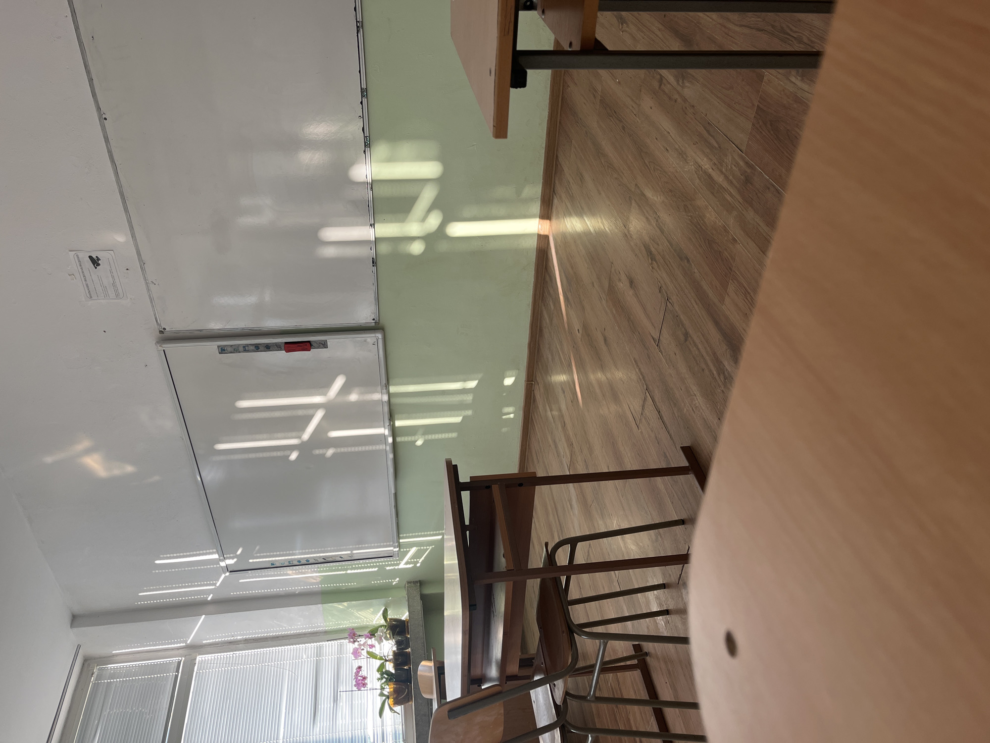 The image presents a classroom interior, focusing on the interplay of light and shadows on the whiteboard, wall, and floor. The room is furnished with wooden desks and chairs, some of which are stacked. Natural light streams in through a window with blinds, casting striped patterns on the surfaces. A potted plant adorns the windowsill. The location cannot be confirmed with the provided information.