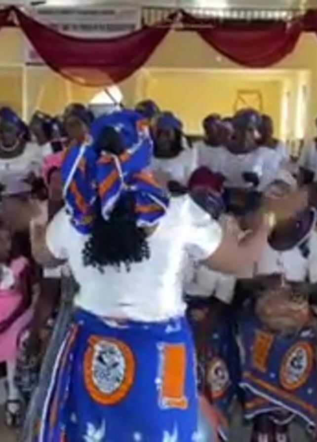 Here is a detailed description of the video: The video shows a group of people gathered inside a building that appears to be a church. Several women are seated in the foreground, wearing traditional clothing with blue and white patterns. Some are playing drums, while others are singing or clapping. In front of them, a small group of young girls in pink dresses sit attentively. A woman in a white shirt and a similar blue and white patterned skirt stands facing the group, leading the performance with animated gestures. Behind the women, there is a larger crowd of people seated in pews, observing the performance. The interior of the building is brightly lit, with cream-colored walls and pillars. A banner hangs overhead, adorned with red fabric. The atmosphere seems lively and festive.