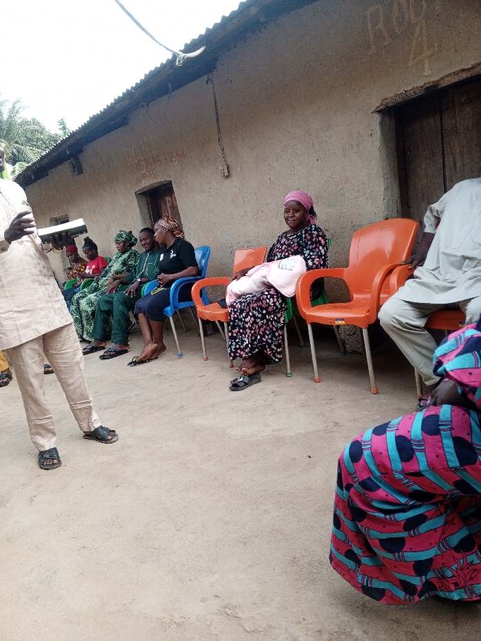The image displays an outdoor gathering in Akwanga, Nigeria, situated in front of a single-story building with light-colored, possibly plastered walls and a corrugated metal roof