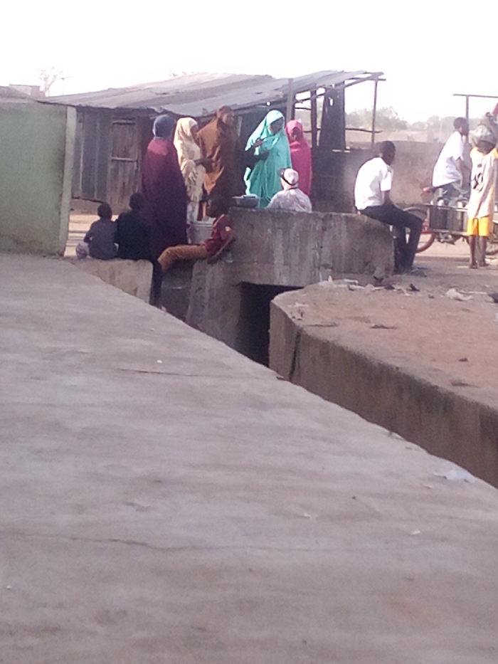 People gather near a small structure. Several individuals wear traditional garments, including hijabs. One man sits on the structure's edge, and another rests on a nearby concrete wall. In the background, there are a few men next to a bicycle and cart. The scene appears to be in a village or rural area. The foreground is dominated by a concrete surface.