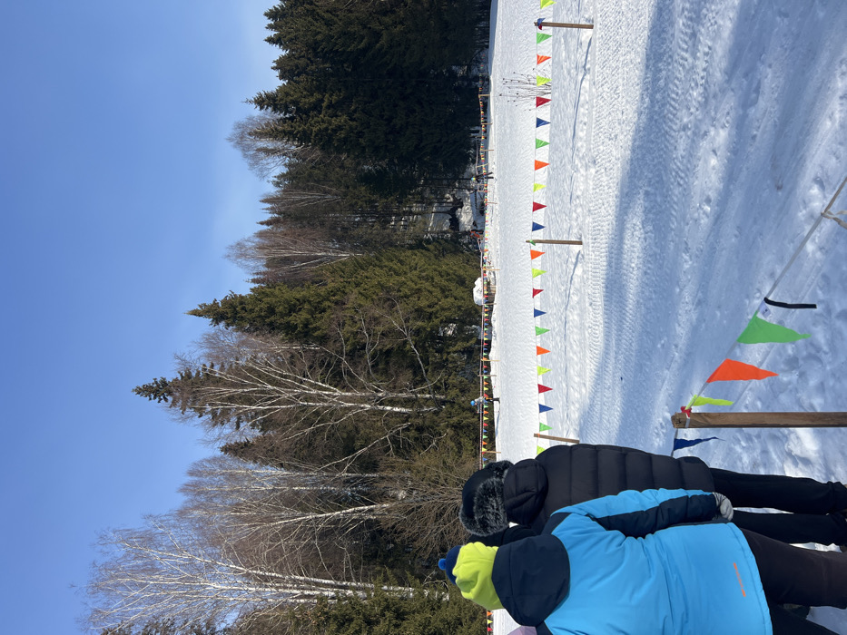 The image depicts an outdoor winter scene in Sergino, Russia, under a clear blue sky. In the foreground, three individuals are viewed from behind, standing on packed snow. The leftmost person wears a bright blue jacket and a neon yellow-green beanie. The middle person wears a black puffer jacket with a fur-lined hood. A third person is partially visible to the right, also in dark winter clothing. A string of multicolored triangular pennant flags (orange, green, red, yellow, blue) is visible in the lower foreground, strung between wooden posts in the snow, forming a barrier or course marker. Beyond this, the mid-ground consists of a wide, snow-covered field with visible tracks, possibly from skis or grooming equipment. Another, longer line of identical multicolored pennant flags delineates a course across the mid-ground. Several distant figures are dispersed across the snowy field, with at least one individual clearly visible on skis in the left-midground. The background features a dense forest composed of tall coniferous trees and bare deciduous trees (likely birches), rising into a gentle slope under the bright sunlight.