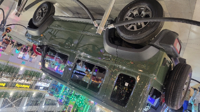 An olive green off-road vehicle is suspended upside down above a commercial space