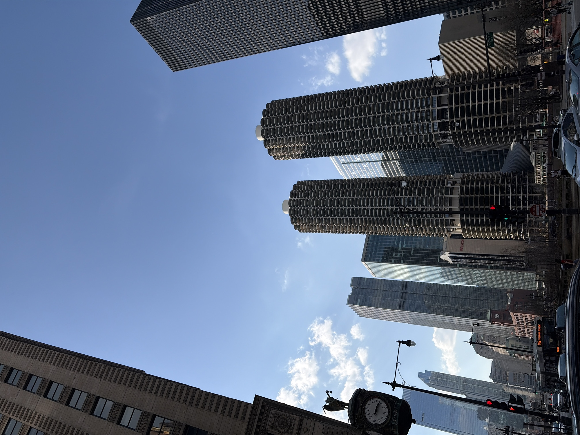 The image is a street-level view looking up at buildings in Chicago, Illinois, United States of America. The iconic Marina City towers are prominently featured, with their distinctive "corn cob" design. Several other modern skyscrapers are visible, including glassy, rectangular structures. A large clock, possibly part of a building facade or a street clock, is visible in the foreground, along with traffic signals. Cars are parked along the side of the road. The sky is blue with scattered clouds.