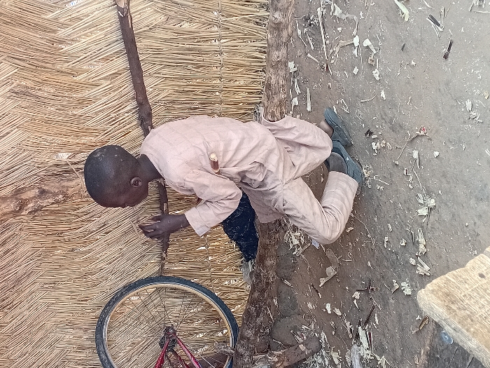 A young boy wearing a light pink outfit and dark shoes is crouched near a wall made of woven reeds. He appears to be working on something attached to a wooden support beam. A bicycle wheel leans against the wall near him. The ground is covered with dirt, wood shavings, and debris. The scene seems to be outdoors or in a simple shelter.