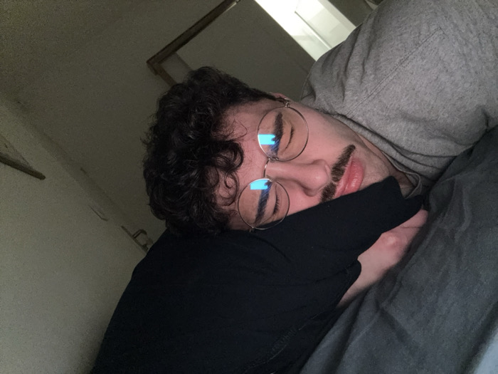 A person with curly dark hair and a mustache rests on a gray bed. They are wearing glasses with a round frame. Their head rests on a folded black fabric. The person is wearing a gray hooded sweatshirt. The lighting is dim, and a corner of the ceiling is visible in the background. The angle is tilted, capturing the person in a relaxed pose.