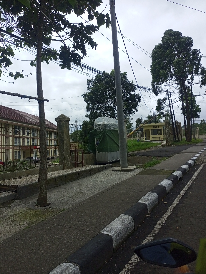 A street view reveals a building with barred windows on the left, next to a stone fence interrupted by a tree growing out of the sidewalk. Across the street, a small yellow guard house labeled "POS 3" stands near another fenced area. Power lines crisscross the overcast sky. A section of black and white curb is visible, with a motorcycle mirror showing in the foreground.