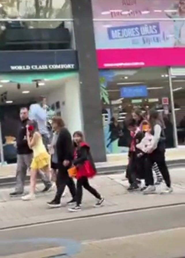 group of pedestrians crossing a street in an urban environment. There are several adults and children in the group, and some of them are wearing costumes. The background includes storefronts with large windows and advertisements. The street has painted crosswalk lines and is lined with trees. A car passes by in the foreground at one point. The camera appears to be moving and filming from a vehicle.