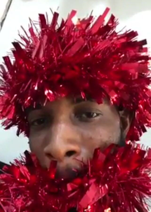 A close-up video shows a person wearing red tinsel as a hat and beard