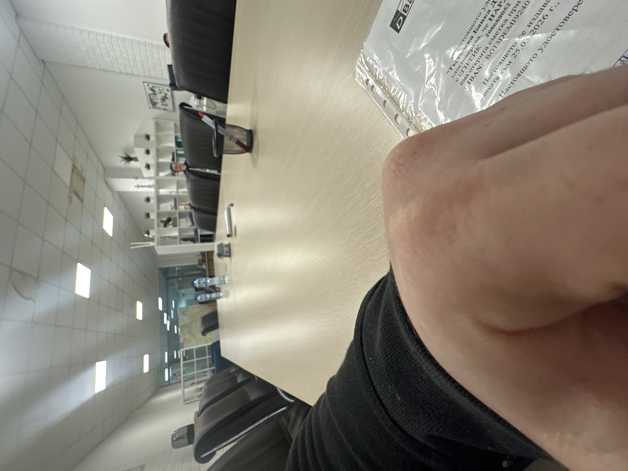 The image depicts a first-person perspective within a modern conference room or office located in Sofia, Bulgaria. The immediate foreground shows the photographer's right knee, covered in dark, possibly black, ribbed fabric. To the right of the knee, resting on a light-colored wooden table, is a clear plastic document protector containing a paper with text in Bulgarian. Visible details include "Търговска банка" (Commercial Bank), an EGN/EIK number "208688052", an IBAN starting "BG13DEMI9240...", and a date "25.03.2026 г.". A logo partially reads "DBA" or "D Bă". The midground features a long, rectangular, light-toned conference table. Objects on the table include a black mesh pen holder containing red and white writing implements, a light blue marker lying horizontally, two plastic water bottles, and a small, miniature white house-shaped object. The background shows a brightly illuminated office environment. Numerous black office chairs with headrests are arranged around the conference table. The walls are predominantly white, with one section exhibiting a textured white brick-like finish. White modular shelving units against a far wall display small green potted plants and binders. Two individuals are discernible in the background: one seated further down the table on the right, looking towards the camera, and another person partially visible behind the table on the left, also facing forward. The ceiling is composed of white acoustic tiles with several illuminated rectangular LED light panels. Visible water stains are present on some ceiling tiles. A glass partition on the left separates the conference room from another illuminated office area, where a blurred map or artwork is visible on a distant wall.
