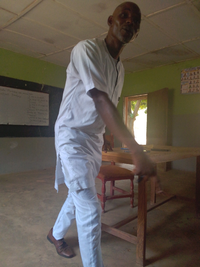 This image depicts an indoor scene, identified as a classroom or meeting space in Saminaka, Nigeria