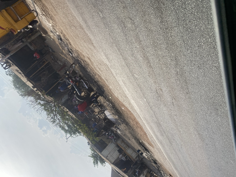 An urban street scene includes a narrow sidewalk lined with buildings, parked motorbikes, and lush trees. A yellow vehicle overhangs the sidewalk. The gray asphalt road dominates the foreground, its surface textured. The sky is visible in the upper left, partially obscured by the trees' branches. The image is tilted, creating a slightly disorienting perspective.