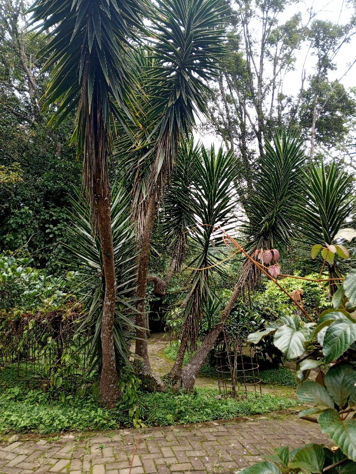 Lush foliage fills a dense garden scene. Prominent are tall yucca trees with spiky green leaves and textured brown trunks. Beneath, a brick pathway winds through the greenery. Other trees and plants add layers of depth, with glimpses of cages or supports for climbing plants. A branch with pale pink leaves cuts across the center, adding color to the predominantly green and brown landscape.