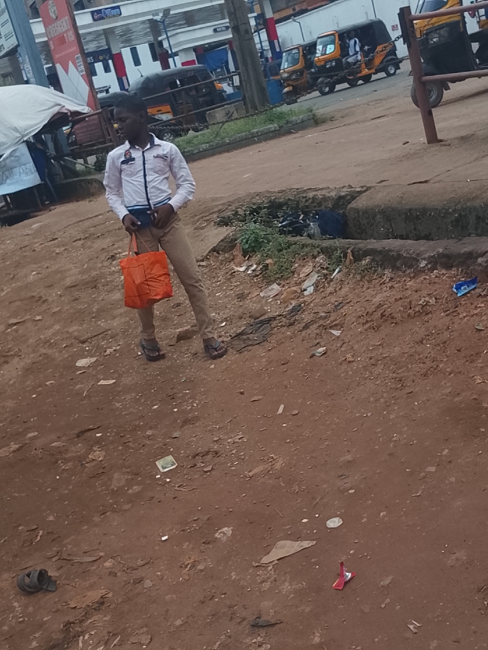 The image displays an urban street scene in Onitsha, Nigeria. A young male, dressed in a white long-sleeved collared shirt, tan trousers, and dark sandals, stands near the center-left, holding an orange tote bag in his left hand. A blue fanny pack is worn around his waist. The ground consists of reddish-brown dirt, sparsely covered with various litter including paper, plastic, a single black sandal, and a red plastic item. To the right of the subject, a concrete drainage channel contains refuse and vegetation. In the background, a paved road features multiple yellow and black tricycles (Keke Napep). A gas station with red and white branding, showing partial text like "CRESCENT," is visible behind the road, alongside a white tarp structure possibly indicating a market stall. A wooden pole rises on the far right. The scene is under diffused daylight.