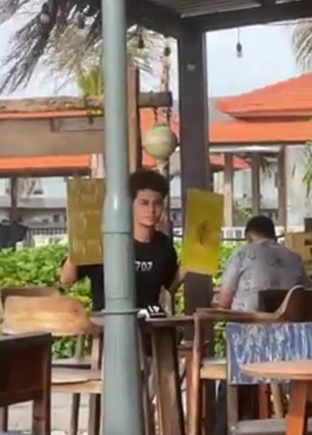 young man standing outdoors at a covered, open-air establishment that appears to be a bar or restaurant. He is holding two yellow-tinted patterned screens, one in each hand, and is smiling and then grimacing at someone who is off-camera. Other people are seated at tables nearby. Palm trees and building rooftops are visible in the background.
