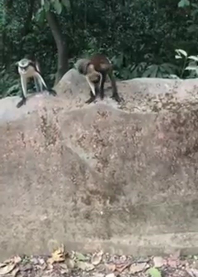 Two monkeys are standing on a grey, mossy rock