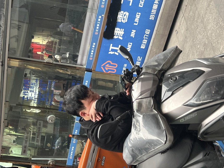 An adult male is observed seated on a stationary gray-silver DJ125 scooter on a paved surface. The male, with short dark hair and wearing a black jacket with light-colored arm stripes, has his right hand supporting his right cheek/jaw area and is operating a smartphone with his left hand. The scooter's handlebars are equipped with clear protective covers and a phone mount. Directly behind the scooter and male is a storefront with large glass panels, reflecting ambient light and showing blurred figures and hanging garments within. Text on the glass indicates "工作时间" (Working Hours) and "周一至周五 上午 07:00-12:00" (Monday to Friday Morning 07:00-12:00). Below the storefront is a blue horizontal sign containing Chinese characters "江津陵工" (Jiangjin Linggong), English text "JIANG JIN LING GO", and phrases such as "职业介绍" (Job Introduction) and "培训服务" (Training Services), identifying the location as Jiangjin, China, near a job or training center.