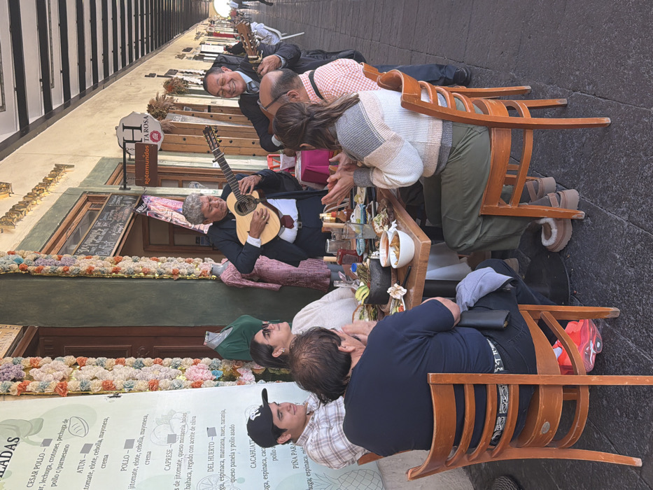 An outdoor café scene shows a musician playing guitar for patrons seated at tables. People are seated on wooden chairs, some clapping along to the music. The restaurant features colorful floral decorations. A menu board is visible, advertising salads with ingredients like chicken, tuna, tomato, and various cheeses. A sign for "Rotamundos TA ROSA" is present. The image is slightly tilted.