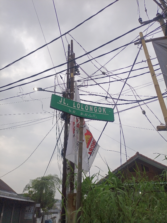 A street sign for "JL. Lolongok" hangs on a utility pole amidst a tangle of electrical wires. Below the sign are two white flags with Indonesian writing, possibly political or organizational banners. Overgrown greenery lines the bottom right, partially obscuring a building with a red-tiled roof. Another building is visible on the left, with a glimpse of a tree in the distance. The sky is overcast.