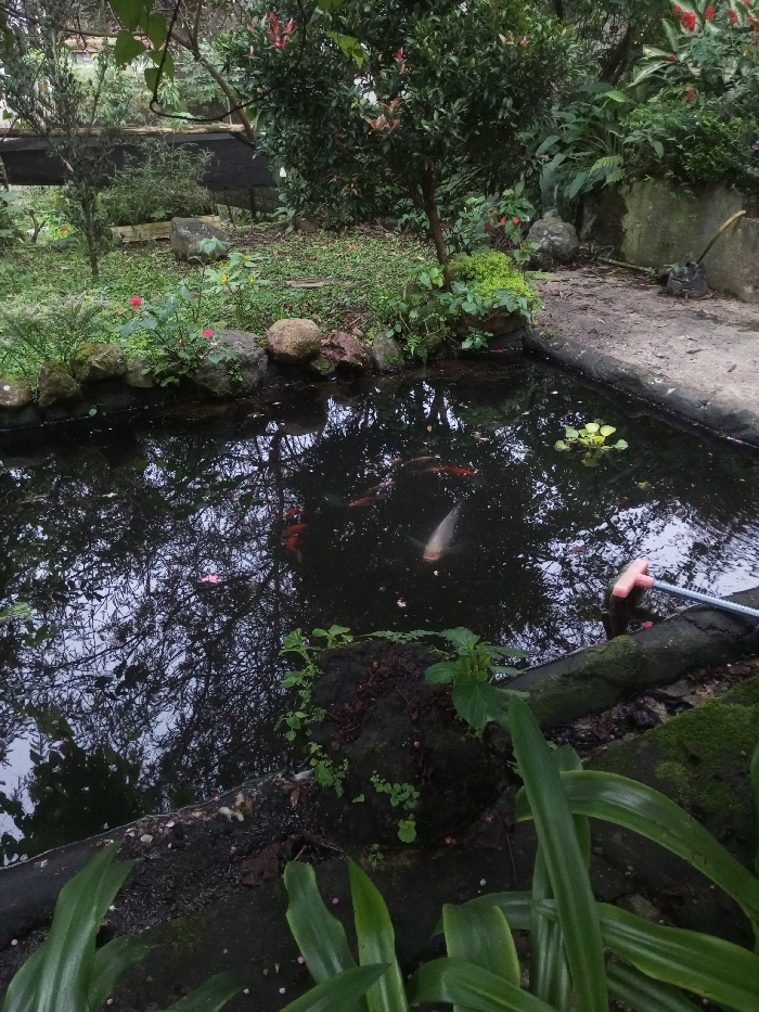 This image captures a garden scene in Ivato, Madagascar, featuring a dark-water koi pond as its central element