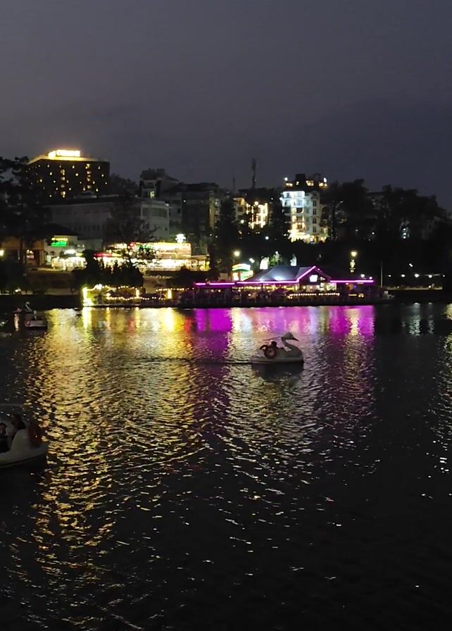 night scene of a body of water, possibly a lake or a large pond, with a waterfront cityscape in the background. The city is illuminated with various lights, including bright white and yellow lights from buildings and streetlights. There's also a structure over the water, possibly a pier or a floating platform, adorned with pink and purple lights. The lights from the city and the structure reflect on the water surface, creating shimmering patterns. Two pedal boats are visible on the water. One boat is closer to the viewer and in the lower part of the frame. Another pedal boat is in the background near the structure, occupied by two people. The sky is dark, indicating it is night.