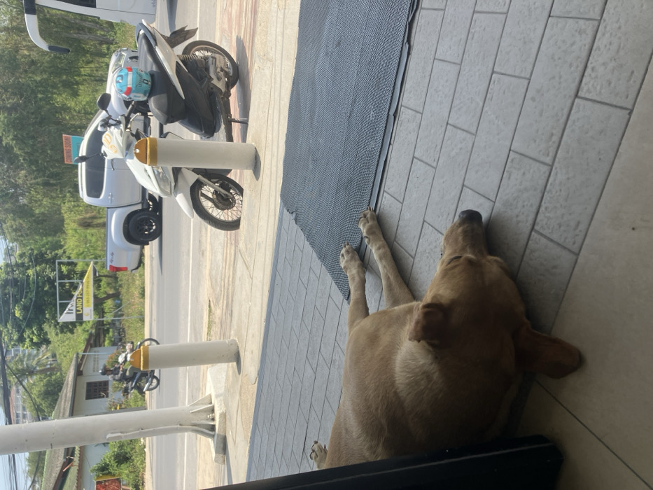 The image depicts a street scene in Choeng Mon, Thailand. In the foreground, a light brown dog is observed sleeping on its left side on a gray rectangular tiled floor, with its head facing right and eyes closed. Its front paws are extended forward and its hind legs are splayed. Adjacent to the dog, a dark gray textured mat lies partially on the tiled floor. Beyond the tiled area, a concrete sidewalk runs horizontally across the midground. Two white cylindrical bollards with yellow tops are positioned on this sidewalk; the left bollard is partially obscured by a larger vertical white utility pole. A white scooter with a black seat is parked on the sidewalk behind the central bollard, facing right, with a blue and white helmet resting on its seat. A paved road is visible beyond the sidewalk. Vehicular movement includes a silver pickup truck traveling or parked further down the road to the left, and a person on a dark motorcycle moving leftward. The front portion of a white bus is visible on the far right of the road. The background features lush green tropical vegetation, including trees and bushes, behind which several low-rise buildings are partially visible. A yellow triangular "LAND FOR SALE" sign with black text and a phone number is prominently displayed amidst the greenery on the left side of the road. Taller buildings are visible in the distant horizon. The scene is illuminated by bright daylight, casting visible shadows.