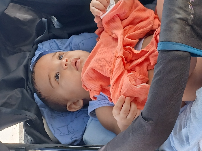 - "An infant is seated upright within a dark-colored stroller, looking upwards and slightly to the right" by FM-XSA4R2, licensed under CC BY 4.0