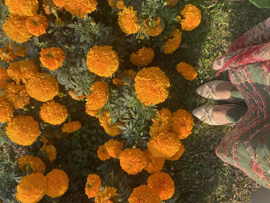 - "A top-down view captures the lower legs and feet of an individual standing on green grass beside a vibrant garden bed of numerous orange marigold flowers" by FM-BeFBg1, licensed under CC BY 4.0