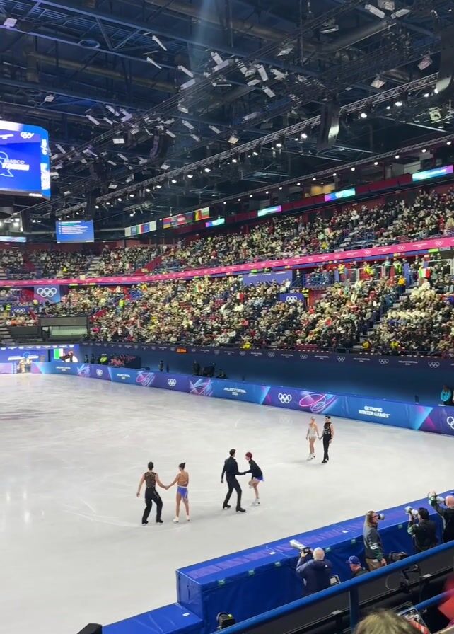 packed indoor arena with figure skaters on the ice. The crowd fills the stadium seats, surrounding the rink marked with "Milano Cortina 2026" and the Olympic rings. Two pairs of figure skaters stand on the ice, one pair in black and blue outfits and another pair in green and black. They appear to be acknowledging each other or coaches. The overhead lighting is bright, with a large screen displaying video above the rink. Several photographers stand close to the ice. The camera is held by an audience member, providing a slightly obstructed view from their seat.