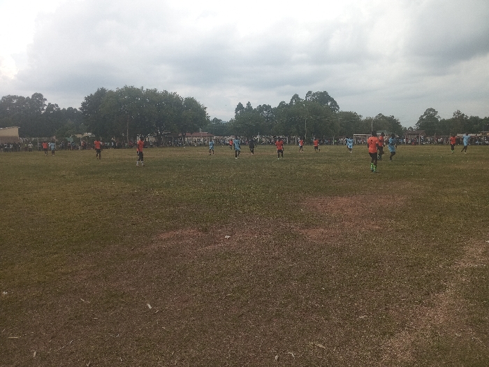 A wide shot depicts an active outdoor football match in Chevaywa ward, Kenya, under an overcast sky