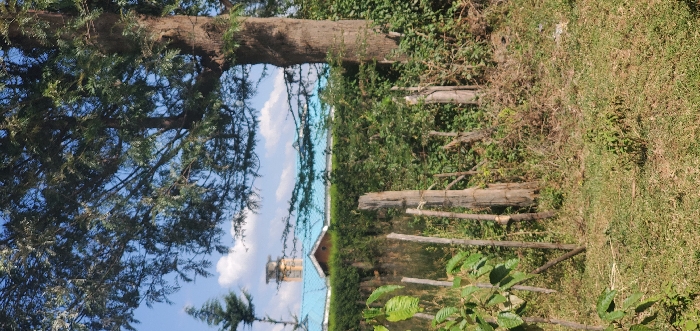 The image displays an outdoor scene in Gilgil ward, Kenya, under a clear blue sky with scattered white cumulus clouds. The foreground consists of grassy ground with areas of exposed soil, several weathered wooden fence posts, and low-lying green vegetation, including a plant with broad leaves on the left. In the midground, a dense line of green foliage forms a visual barrier. Behind this foliage, a building with a light blue corrugated metal roof is visible, along with a smaller section of a building featuring a brown wooden exterior and a pitched roof. A tall, tan-colored tower, possibly a water or communication tower, rises in the background on the left. A large, mature tree with a thick, textured brown trunk and dense green needle-like foliage occupies the right side of the frame. Another smaller, conical evergreen tree is partially visible on the far left. No individuals, actions, or specific interactions are depicted.