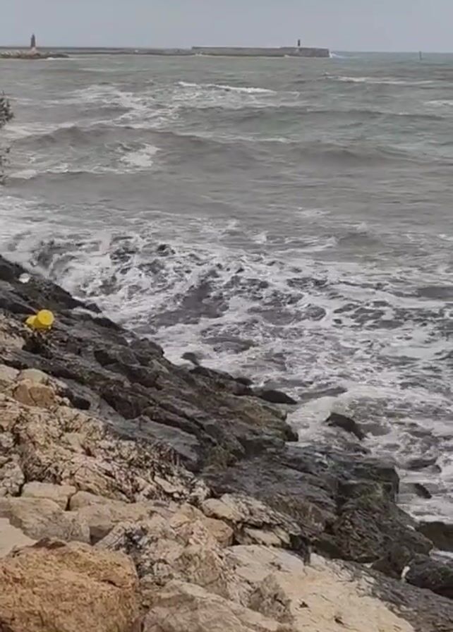 rocky shoreline on a cloudy day, with a turbulent sea. Waves crash against the rocks, creating white foam. In the distance, there is a long pier or breakwater with two red lighthouses. A single yellow object, possibly a container, sits on the rocks in the foreground. There are no visible people.