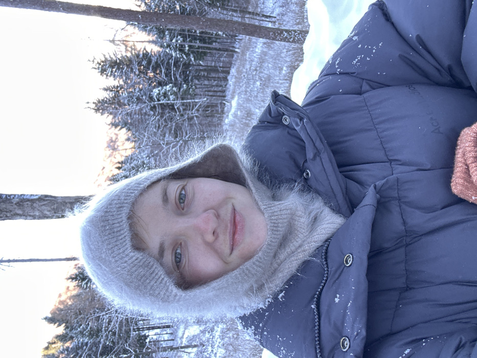 An individual, appearing female, is depicted in a close-up outdoor portrait, looking directly at the camera with a slight smile. The subject wears a light gray, fuzzy knitted balaclava-style hood that covers the head and neck, and a dark blue or gray puffer jacket. Small snowflakes are visible on the balaclava and jacket, particularly on the shoulders. A partial view of a reddish-brown knitted glove or mitt is visible at the bottom right. The jacket bears faint "Acne Studios" branding on the left chest area. The background shows a snow-covered forest environment. Pine or fir trees, also laden with snow, extend into the distance, suggesting a hillside or mountainous terrain. Bare tree trunks are visible vertically within the frame, particularly one prominent trunk on the right side. The ground is uniformly covered in fresh, undisturbed snow. In the far background, distant peaks or a ridge line are visible, illuminated with a warm, orange hue, indicating either sunrise or sunset. The sky above is bright and mostly clear. This snowy landscape is consistent with higher elevation areas in the vicinity of Bellagio, Italy.