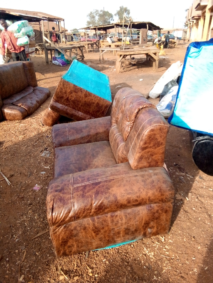 An outdoor scene displays a dissembled brown leather couch with visible blue fabric underneath, set on reddish-brown dirt. A two-seater couch sits in the background. People and market stalls are seen at a distance. A blue covering lies to the right, partially obscuring a dark object. The area appears to be a commercial or market setting.