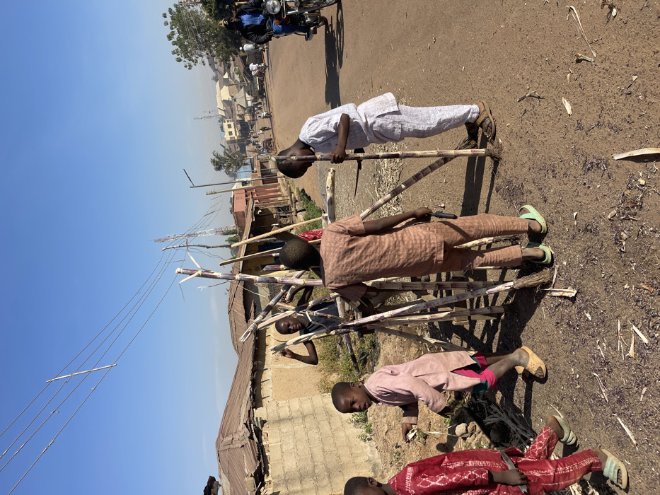 The image displays an outdoor street scene in Unguwar Gabas, Nigeria, under a clear blue sky. Six children, predominantly young males, are actively engaged in processing sugarcane on an unpaved, reddish-brown dirt road. The ground around them is extensively littered with purple and white sugarcane peelings and stalk fragments. A makeshift structure, constructed from several upright sugarcane stalks, stands centrally. In the foreground, from left to right: 1. A child in a red patterned garment walks left, holding a small bladed tool in his right hand and a piece of sugarcane in his left. He wears light green slip-on sandals. 2. A child in a light pink/brown long-sleeved tunic and dark leggings walks right, observing the central activity. He wears light brown slip-on sandals. 3. A child in a dark shirt stands directly behind the sugarcane structure, looking towards the viewer. 4. A child wearing a light brown patterned short-sleeved outfit and light green slip-on sandals stands with his back largely to the viewer, holding a bladed tool in his right hand near the structure. 5. Another child in a dark shirt is partially visible behind the structure, to the right of the third child, looking right. 6. A child in a white patterned long-sleeved tunic and trousers, wearing brown sandals, stands on the right, holding a long sugarcane stalk vertically with both hands, indicating peeling or preparation. In the mid-ground, to the left, are single-story residential buildings with corrugated metal roofs and exposed concrete block walls. Overhead, multiple power lines are visible. An unpaved road extends into the distance on the right, where a male riding a motorcycle is observed moving away from the viewer. Indistinct figures, additional buildings, and a distant communication tower are visible further down the road against a hazy horizon.