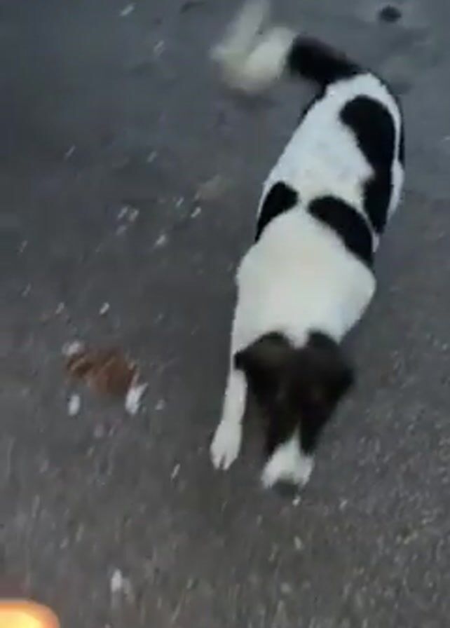 person interacting with two dogs. The dogs are on a gray asphalt surface with some debris. One dog is black and tan, and the other is white with black patches. The white and black dog approaches the person, who then pets it. The black and tan dog stands nearby, observing. The background includes some vegetation and what appears to be a paved area. The lighting suggests it might be dusk or early morning.