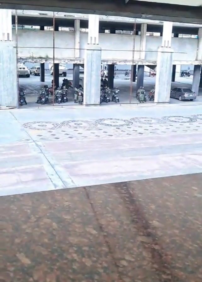 large, open-air parking area under an overhead structure with large support columns. Several individuals dressed in military-style uniforms are gathered around motorcycles parked in designated spots. There are multiple vehicles parked in the background as well. The camera is positioned at an elevated angle, likely from inside a building looking out. The floor area in front of the motorcycles has a patterned design. The overall setting appears to be a secure or restricted area.
