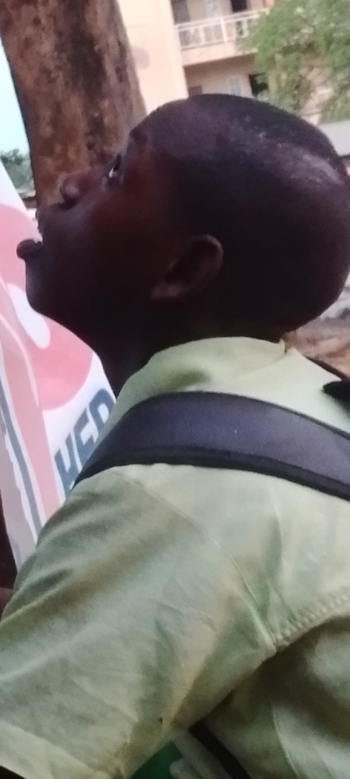 The image depicts a young, dark-skinned individual in a side profile, looking upwards and to the right, with their mouth slightly open. They are wearing a light green collared shirt and a black strap, likely from a backpack, across their left shoulder. Behind the individual's left side, a partial white and red banner with blue lettering (appearing as "WED" or similar) is visible. To the left of the frame, a textured brown surface resembling a tree trunk is present. In the background, to the right, a light-colored building with a white-railed balcony is visible, along with green foliage. The scene is located in Adankolo, Nigeria.