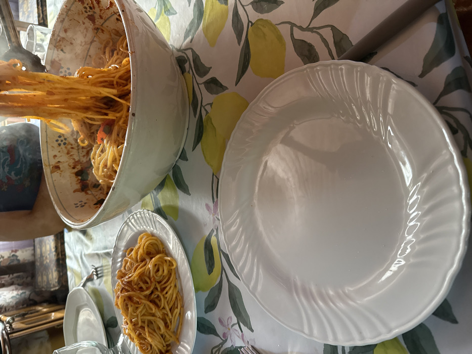 The image captures an indoor dining scene in Cutrofiano, Italy, focused on the serving of spaghetti. The table is covered with a white tablecloth patterned with yellow lemons and green foliage. In the foreground, an empty white plate with a distinctive swirling rim design is positioned. To its upper left, a similar white plate holds a portion of spaghetti coated in a red sauce. A metal fork is visible beside this plate. Centrally located, a large, white ceramic serving bowl, featuring dark decorative marks near its upper rim, contains a significant amount of spaghetti mixed with a red sauce. Visible steam rises from the pasta, indicating its hot temperature. Metal tongs are actively engaged in lifting a substantial portion of spaghetti from this serving bowl, poised for transfer. In the upper left background, a partially visible individual is seated at the table, their torso and arm visible, wearing a dark top with an indistinct pattern. An additional empty white plate and a clear drinking glass are also present in this area. A second clear drinking glass is partially visible in the upper right background. The background suggests a domestic interior.