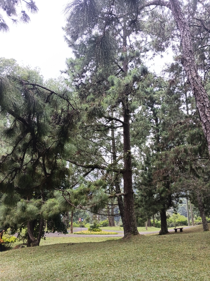 Lush green grass covers the foreground of a park-like setting. Towering pine trees dominate the scene, their needles creating a dense canopy overhead. A paved path meanders through the trees, with a small bench visible in the distance. The day appears overcast, casting soft light on the landscape. Other trees and shrubs frame the path, adding depth to the view.